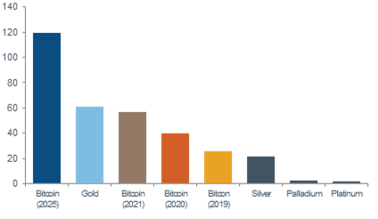 Note: A Goldman Sachs report from 2015 estimated that the last of gold from known reserves will be mined by ~2035 and the last of platinum will be mined ~2055. The last bitcoin will be mined around 2140.