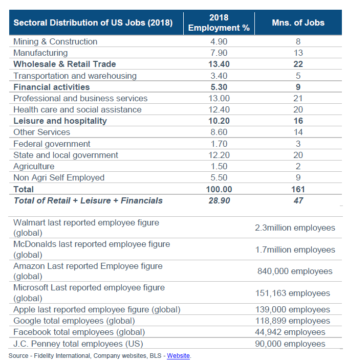 Just in USA, together the three sectors of Retail + Leisure + Financials, i.e. sectors most impacted by the crisis account for 28% or 47 million of the total 161 million jobs (see table above).
